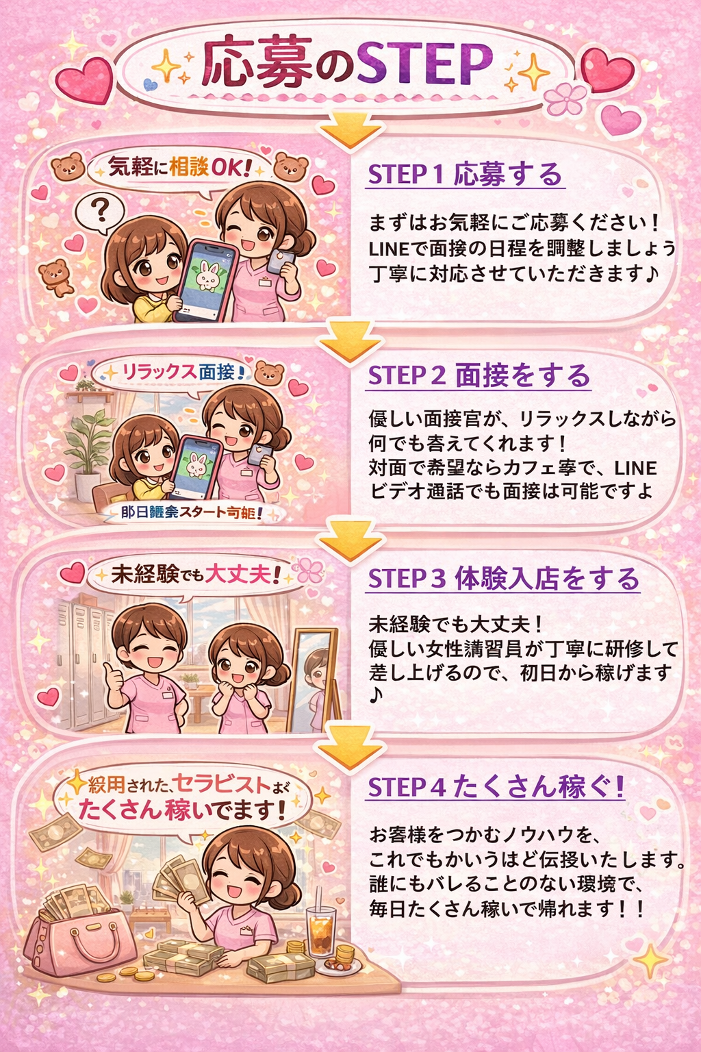 | 募集要項 | ・20~30代の健康的で、常識のある女性 ※掛け持ちは可能ですが、必ずご申告いただくようお願いいたします。 |